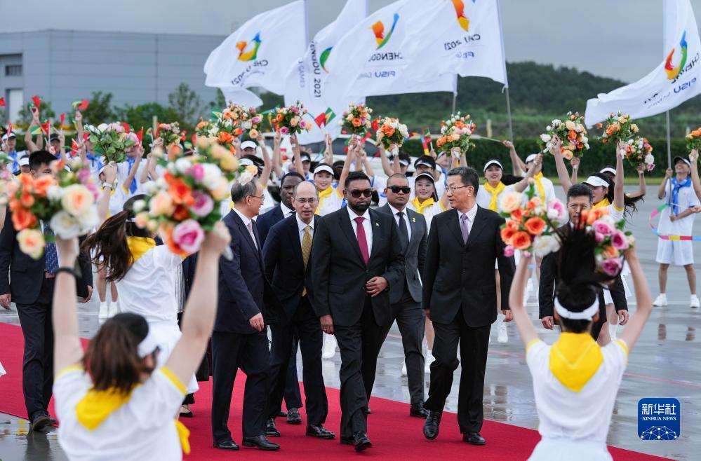 7月27日下午,來(lái)華出席成都大運(yùn)會(huì)開幕式并訪問(wèn)的圭亞那總統(tǒng)阿里抵達(dá)四川省成都市。