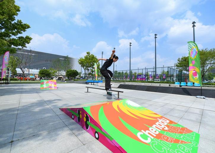 4月19日,滑板愛(ài)好者在成都東安湖體育公園練習(xí)滑板。新華社記者 王曦 攝