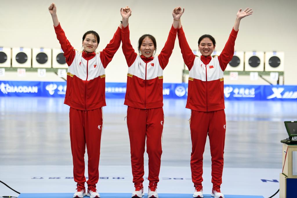 8月1日,中國(guó)隊(duì)選手熊亞瑄、林雅茜、王珂怡(從左至右)在頒獎(jiǎng)儀式上慶祝。當(dāng)日,在成都大運(yùn)會(huì)射擊女子25米手槍比賽中,她們獲得團(tuán)體冠軍。新華社記者曹祎銘攝