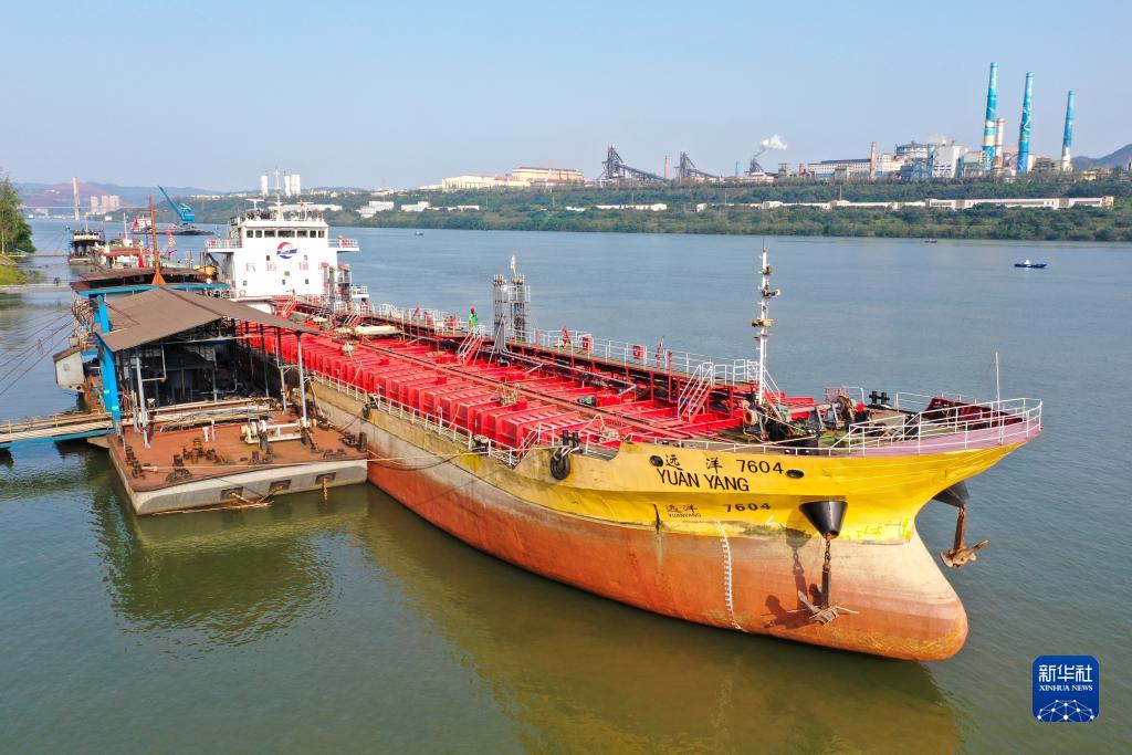 10月17日,在中國石化集團重慶川維化工有限公司物流碼頭,出口的產(chǎn)品正在裝船(無人機照片)。
