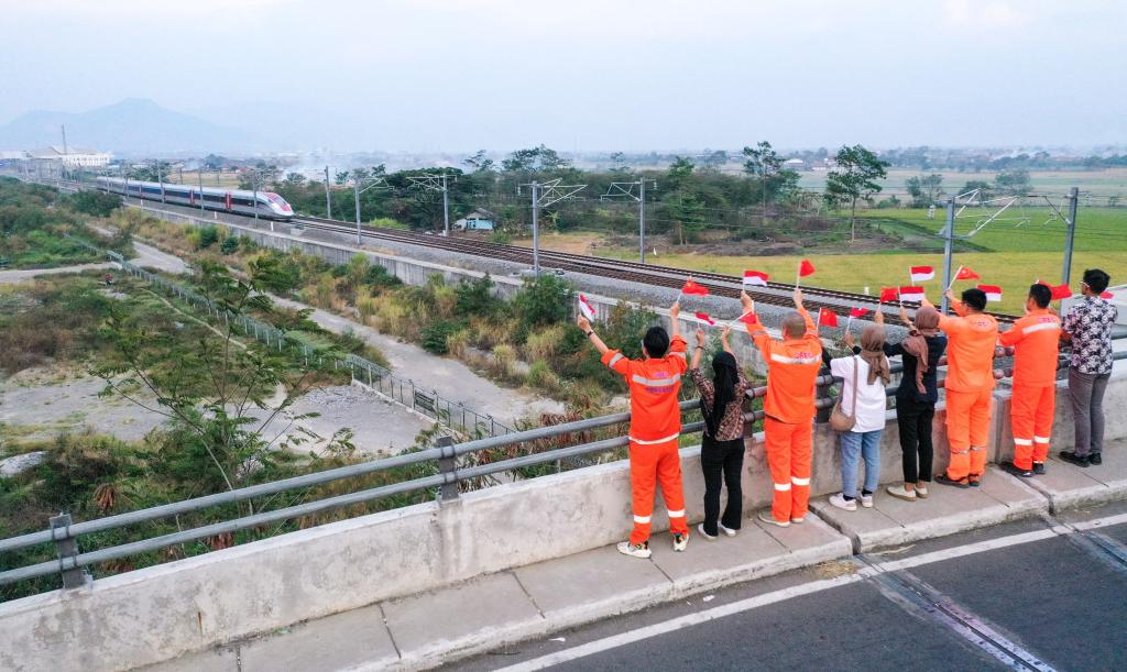10月17日,在印度尼西亞萬隆一座天橋上,雅萬高鐵建設(shè)單位之一中鐵電氣化局的中國和印尼籍員工揮舞著中國和印尼兩國國旗,向遠(yuǎn)處駛來的一列雅萬高鐵高速動車組列車歡呼(無人機照片)。新華社記者徐欽攝