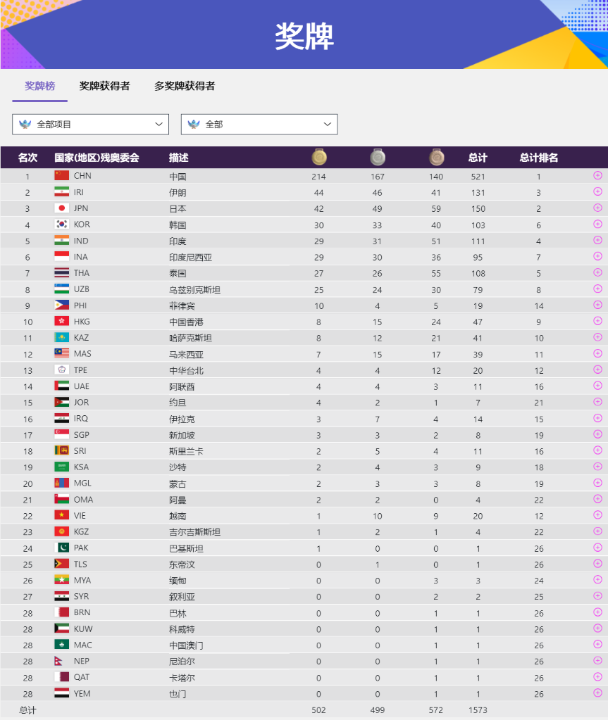 金牌大戶田徑當(dāng)天共決出15枚金牌,中國隊(duì)斬獲其中5枚,以46金43銀33銅的戰(zhàn)績穩(wěn)居首位。伊朗和印度分別以21金和18金排名第二、第三。
