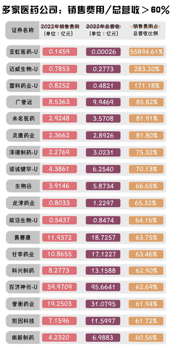 2.多家藥企銷售費(fèi)用占總營收的比例超過60%