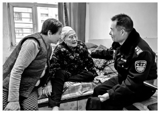 圖為民警王剛來(lái)到95歲的魏大娘家中進(jìn)行春節(jié)慰問(wèn),并提供便民服務(wù)。
