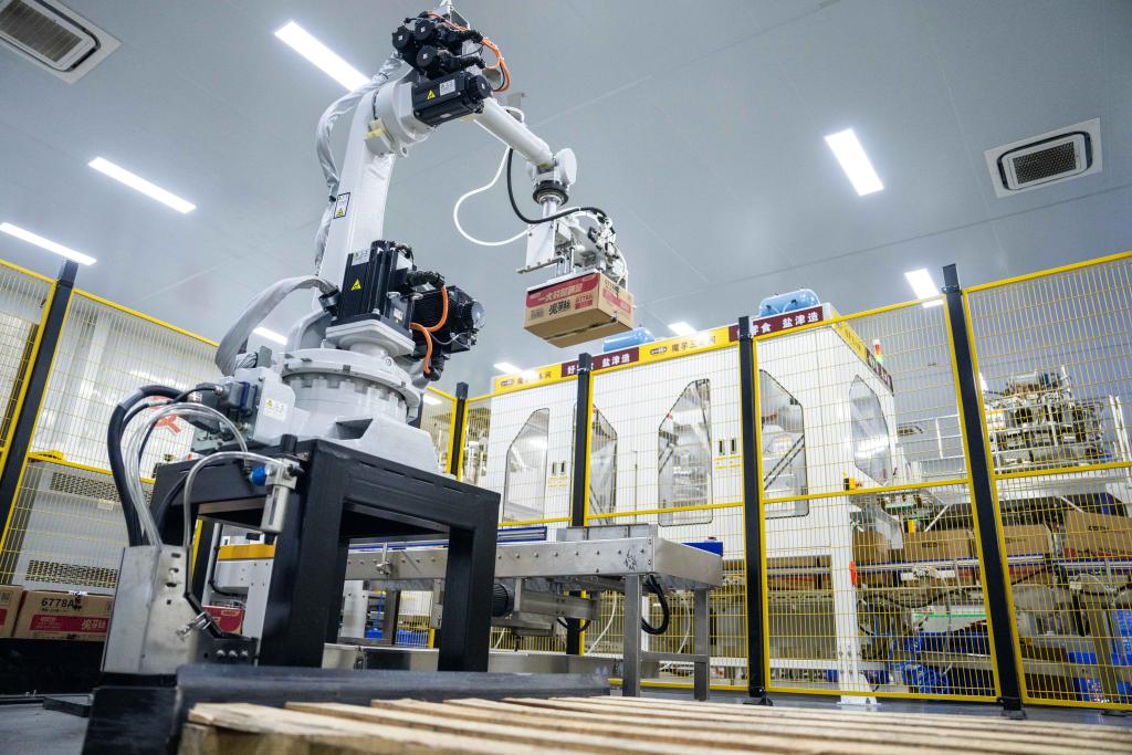 2023年11月23日,在瀏陽(yáng)市大魔王魔芋食品生產(chǎn)車間,工業(yè)機(jī)器人在運(yùn)輸產(chǎn)品。新華社記者 陳思汗 攝