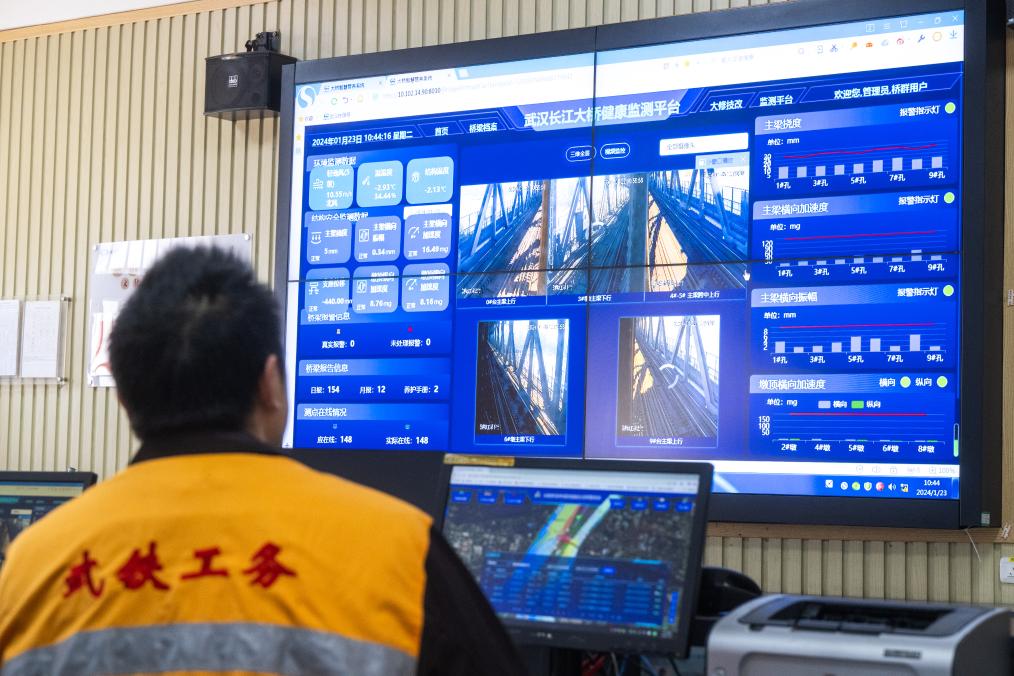 1月23日,武漢長江大橋橋梁車間員工在主控室對武漢長江大橋進行監(jiān)測。新華社記者肖藝九 攝