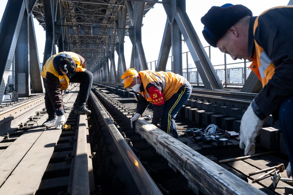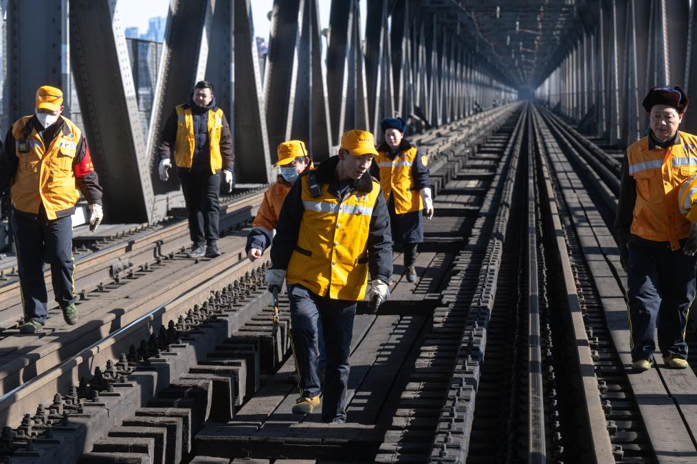 農(nóng)歷大年初三,湖北武漢陽光明媚?!叭f里長江第一橋”——武漢長江大橋宛若一條巨龍飛架于江水之上,氣勢恢宏。身穿工作服的陳卿明和同事,低頭、彎腰,循著大橋鐵道仔細地檢視鋼梁、枕木。