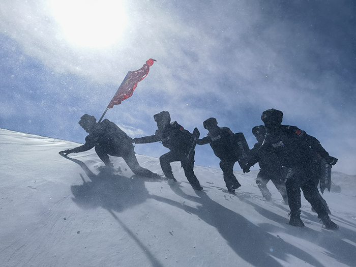 高低不平的碎石路被積雪厚厚覆蓋,很容易讓人忘記腳下暗藏坑洼。大家小心翼翼踩在被凍酥的雪面上,腳底下咔咔作響。民警王煒?lè)寮缈竾?guó)旗走在隊(duì)伍最前列,狂風(fēng)把國(guó)旗旗面吹得左右撞擊,發(fā)出噼里啪啦的聲響。這一抹鮮艷的中國(guó)紅,在皚皚白雪映襯下,格外奪目。