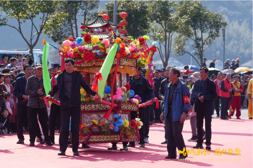 有一支特殊的隊(duì)伍格外引人注目——八名身強(qiáng)力壯的村民抬著一臺特殊的“閣樓”,閣樓上立有幾個(gè)身著鮮艷古代戲劇服裝的人偶?!疤чw也被稱為‘流動(dòng)的戲臺’,郭巨抬閣迄今已有300多年歷史。多年來,當(dāng)?shù)厝藗円恢庇锰чw祈福,希望國泰民安、風(fēng)調(diào)雨順。”郭巨抬閣非遺傳承人趙其立向游客介紹著抬閣,郭巨抬閣集歷史故事、神話傳奇于一體,融舞蹈、繪畫、戲曲雜技等藝術(shù)為一身,充分展示了郭巨民間藝術(shù)的豐富多彩。