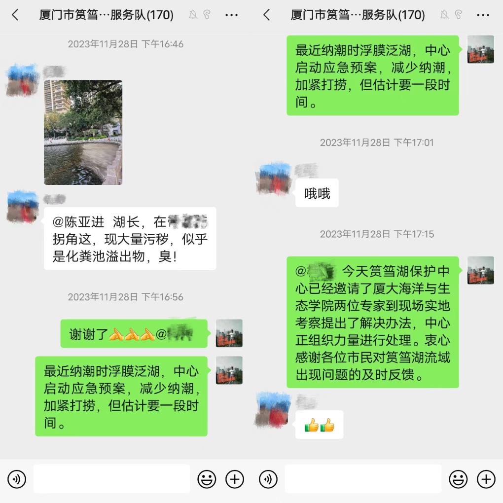 “你看,微信群里有人反映小區(qū)門口的湖水里有疑似化糞池溢出物,我們核實后啟動了應(yīng)急預(yù)案,筼筜湖保護(hù)中心邀請專家實地考察后給出了解決方案。”陳亞進(jìn)指著手機(jī)屏幕向記者介紹道。在這個名為“廈門市筼筜藍(lán)志愿服務(wù)隊”的微信群中,時不時有人@湖長反映問題,“這些都是我們志愿服務(wù)隊的骨干,他們發(fā)現(xiàn)問題就@我,我上報給筼筜湖保護(hù)中心,由他們來解決問題?!?/p>
