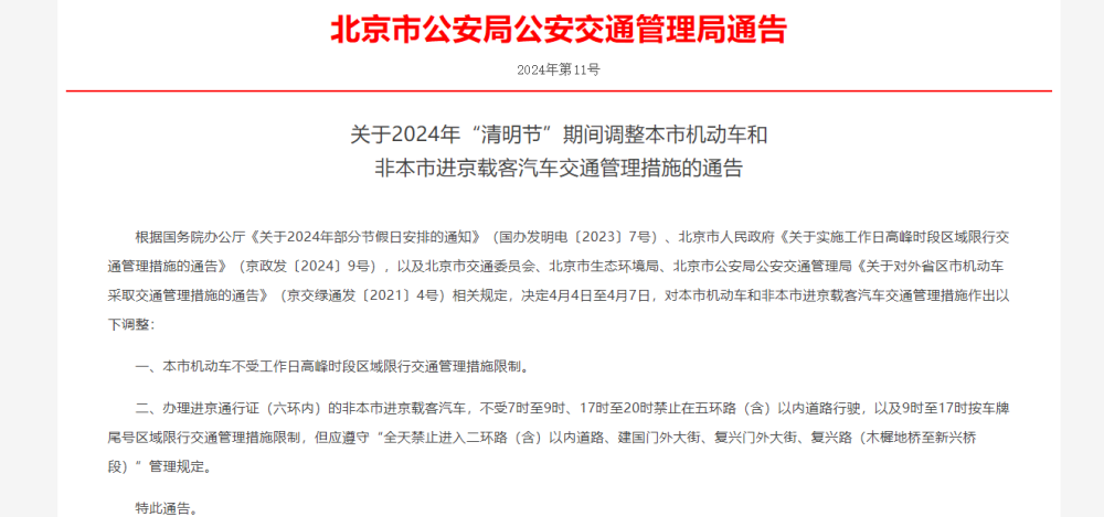 關(guān)于2024年“清明節(jié)”期間調(diào)整本市機(jī)動(dòng)車和非本市進(jìn)京載客汽車交通管理措施的通告