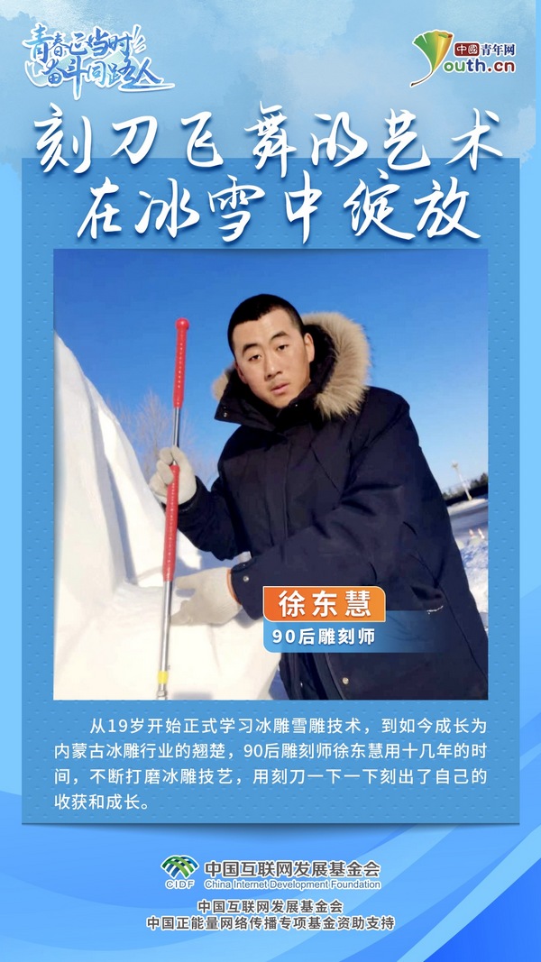 “剛開始做冰雕的時(shí)候,感覺(jué)這個(gè)工作很苦很累,有時(shí)候在冰天雪地里一待就是一整天。當(dāng)時(shí)也產(chǎn)生過(guò)放棄的想法,行業(yè)的一些前輩就一邊教我工作一邊鼓勵(lì)我,引導(dǎo)我,也是在他們的幫助下,我堅(jiān)持了下來(lái)?!毙鞏|慧說(shuō),“后來(lái)我慢慢有了自己的團(tuán)隊(duì),從剛開始的幾人到幾十人,現(xiàn)在已經(jīng)是個(gè)一百多人的團(tuán)隊(duì)了?!庇捎诔D甑牡蜏貞敉夤ぷ鳎L(fēng)吹日曬讓他的皮膚變得黝黑且粗糙,也見證了他從一個(gè)青澀的學(xué)徒,成長(zhǎng)為一個(gè)冰雕團(tuán)隊(duì)負(fù)責(zé)人的歷程。