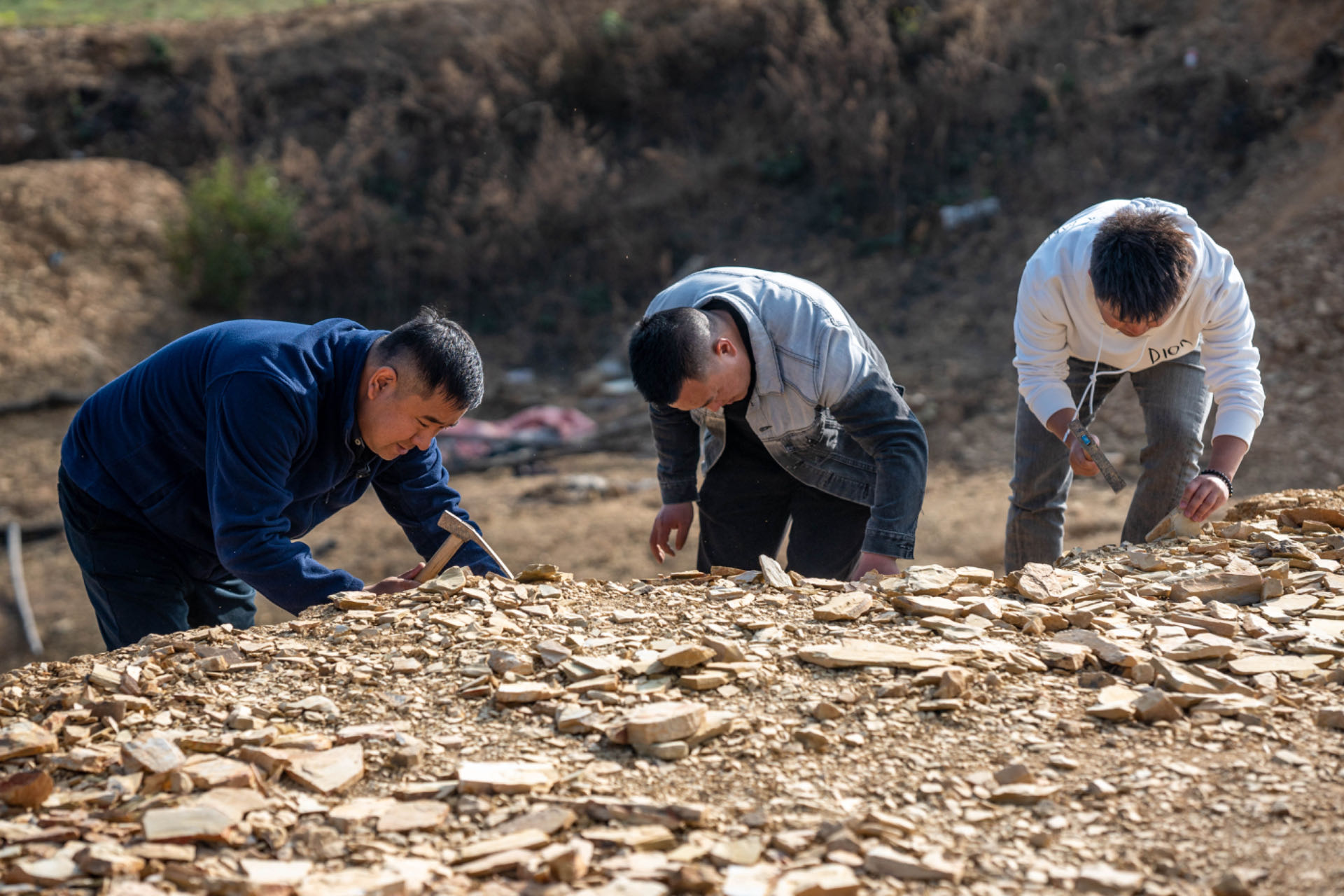 全國人大代表郭進(jìn)(左一)在野外進(jìn)行化石零星采集。