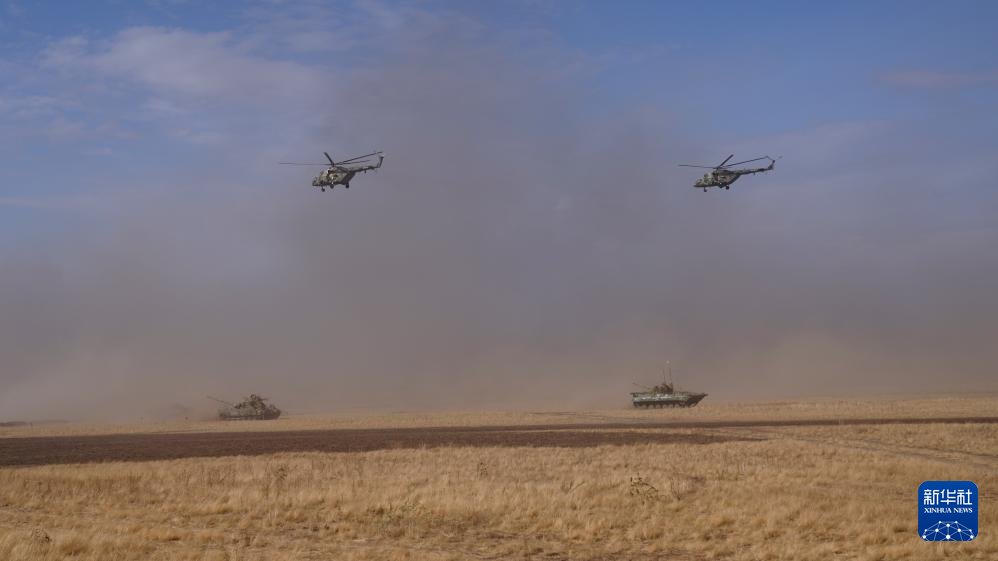 2021年9月23日,在俄羅斯奧倫堡州東古茲靶場舉行的“和平使命-2021”上海合作組織聯(lián)合反恐軍事演習(xí)實兵實彈演習(xí)中,多國聯(lián)合部隊進行陸空協(xié)同作戰(zhàn)。新華社記者 梅世雄 攝
