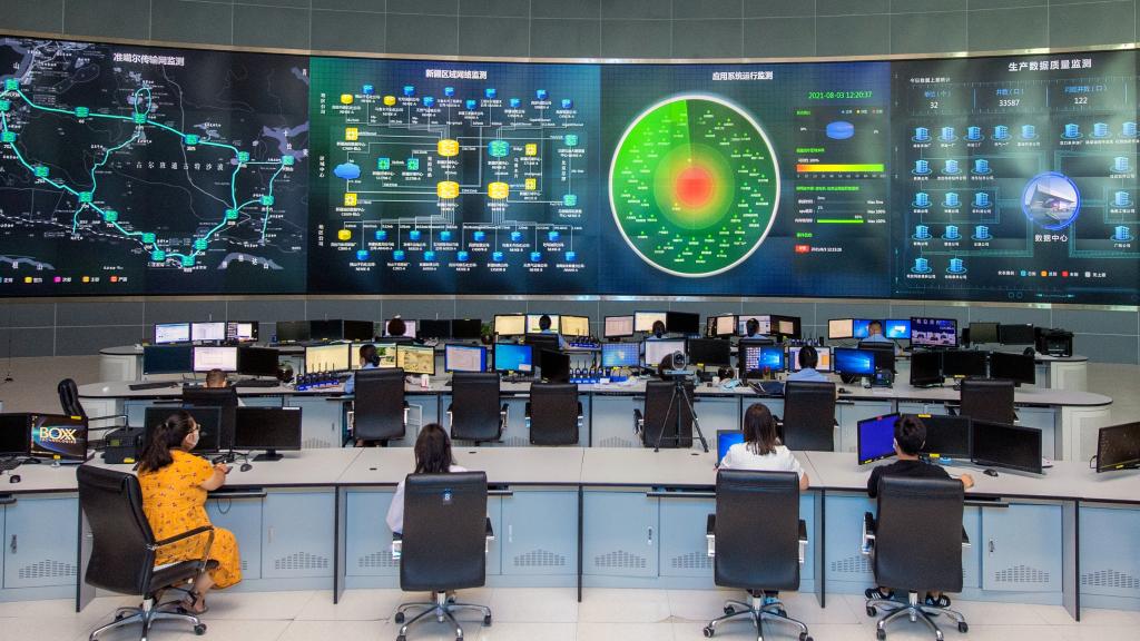2023年12月6日,中國(guó)石油新疆油田公司生產(chǎn)指揮中心的監(jiān)控大屏實(shí)時(shí)顯示油田生產(chǎn)動(dòng)態(tài)數(shù)據(jù)。新華社發(fā)(閔勇 攝)