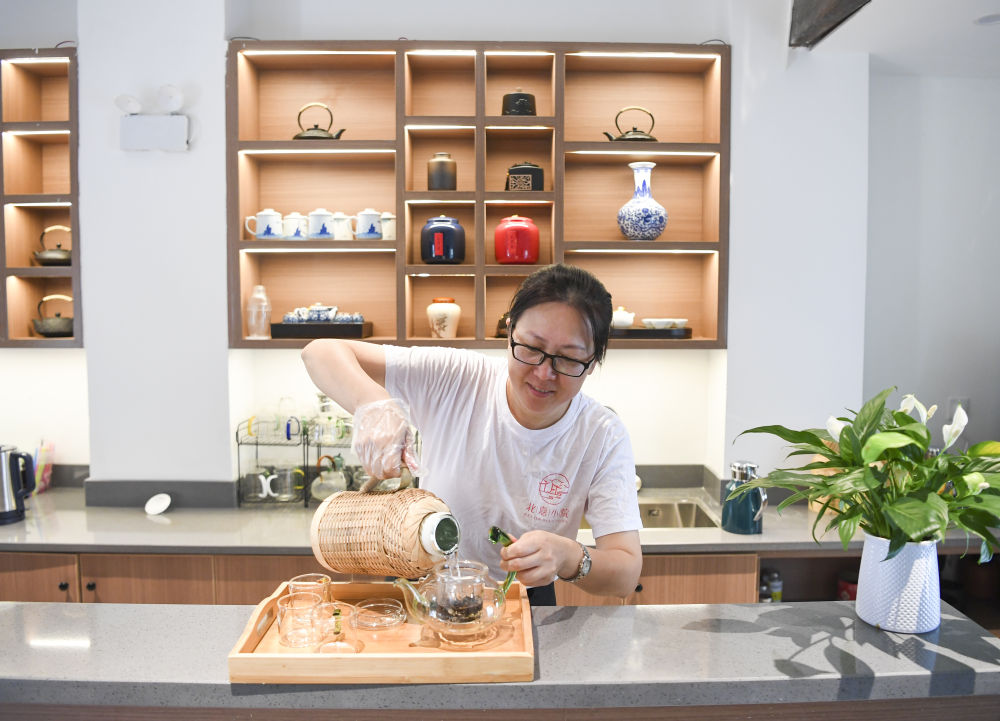 ↑7月15日,重慶市江北區(qū)洋炮局1862文創(chuàng)園內(nèi)的一茶館工作人員在泡茶。