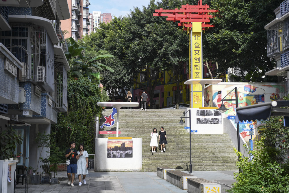 ↑7月15日,游客在重慶市江北區(qū)北倉(cāng)文創(chuàng)街區(qū)游覽。