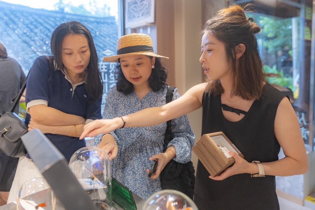 7月28日,在龍門浩老街·下浩里,青年創(chuàng)業(yè)者曾進(右一)在她主理的方舟遺留物·標本工作室內(nèi)為游客講解標本知識。新華社記者 黃偉 攝