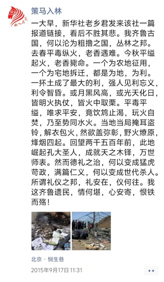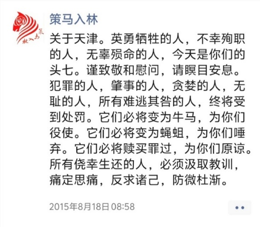 以上三帖,分別為天津8·12濱海新區(qū)爆炸事故“頭七”、山東平度平邑發(fā)生傷民案件、聲援鐵肩擔(dān)道義記者等所發(fā)。多年來,一些案事件頻頻發(fā)生,源于當(dāng)事地方或部門瀆職不作為或?yàn)E權(quán)亂作為,造成嚴(yán)重后果,令人觸目驚心。正氣感召,責(zé)無旁貸,匕首投槍,敢于斗爭。