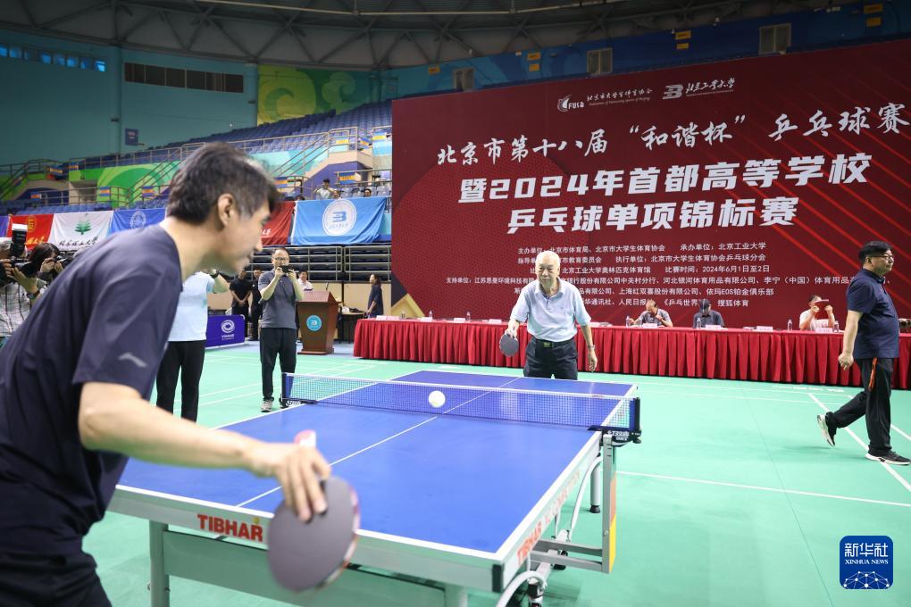 這是2024年6月1日,張燮林(后中)為北京市第十八屆“和諧杯”乒乓球賽暨2024年首都高等學(xué)校乒乓球單項(xiàng)錦標(biāo)賽開(kāi)球。新華社發(fā)