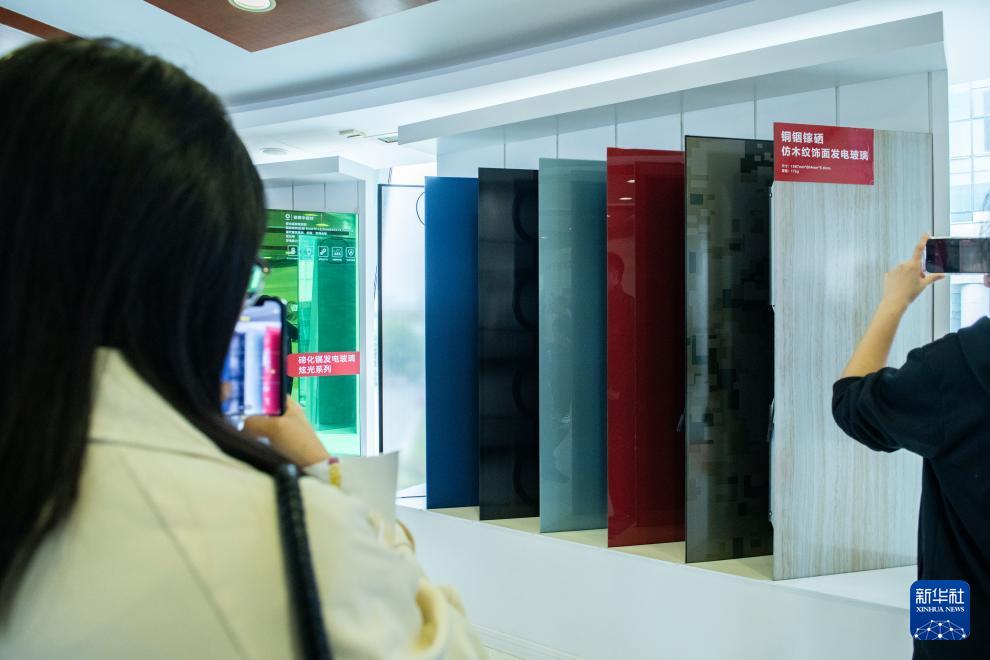 這是浮法玻璃新技術國家重點實驗室內(nèi)展出的銅銦鎵硒仿木紋飾面發(fā)電玻璃等研發(fā)產(chǎn)品(11月8日攝)。