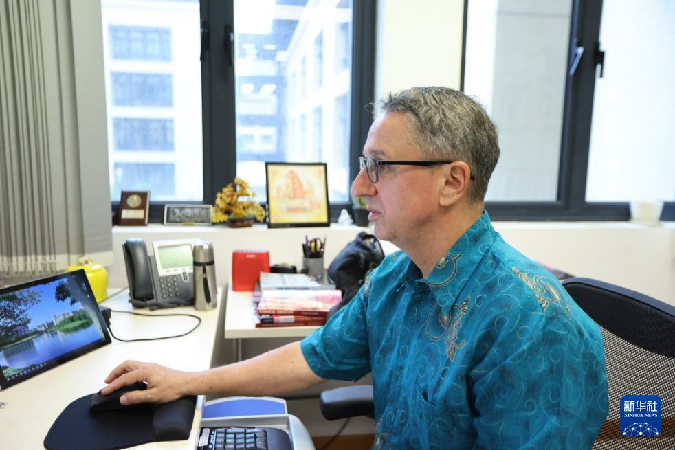 2024年11月14日,澳門大學(xué)社會(huì)科學(xué)學(xué)院副教授、來自美國的托德·萊爾·桑德爾(中文名申大德)在辦公室工作。新華社記者 梁家駿 攝