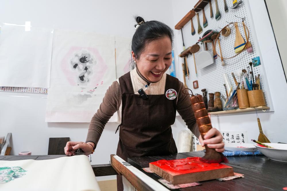 1月19日,游客在一團(tuán)和氣館中體驗(yàn)桃花塢木版年畫(huà)產(chǎn)品。新華社發(fā)