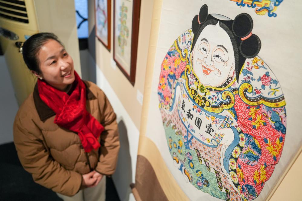 1月8日,喬蘭蓉在觀看桃花塢木版年畫作品《一團(tuán)和氣》。新華社記者 李博 攝