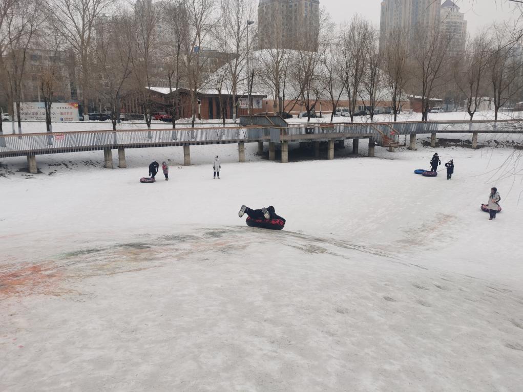 在哈爾濱湘江公園,28日一早,10歲的黃梓天就和爸爸一起來玩雪圈。這處公園里形成的自然雪坡,每年冬季都成為市民滑雪圈的好去處?!霸缟虾⒆右獊恚蛶е^來玩一會,也是一種過年的方式?!秉S梓天的父親黃文說。