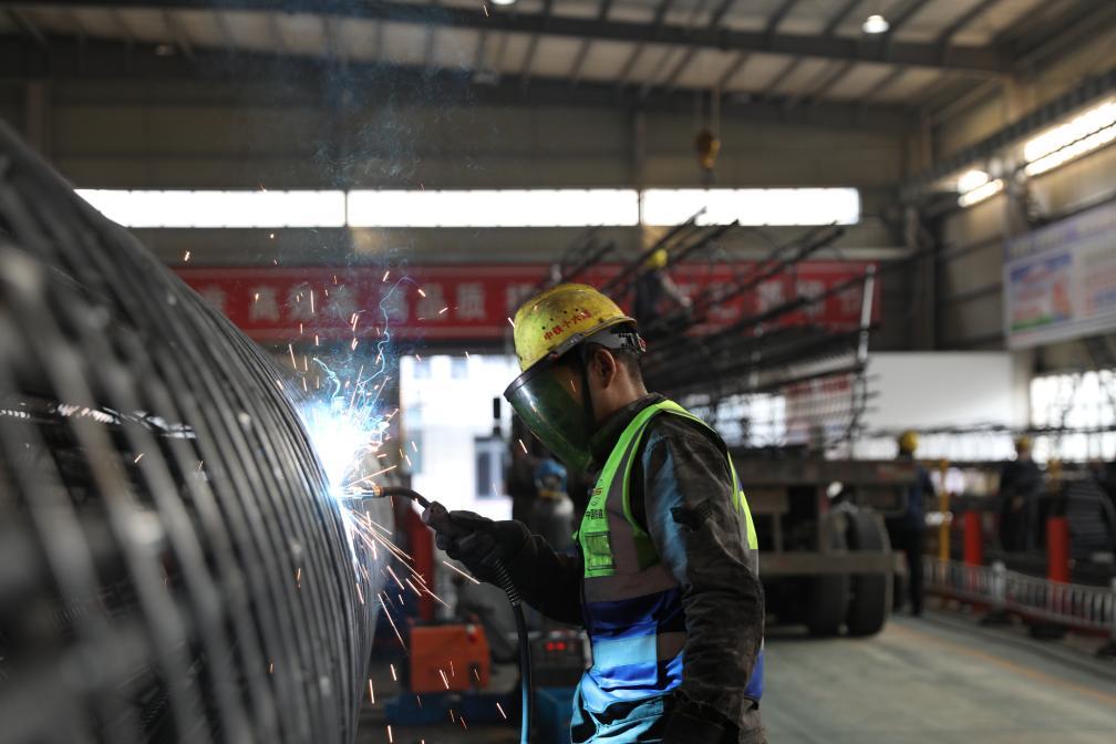 圖為通蘇嘉甬高鐵項目施工人員進行鋼筋籠焊接。(中鐵十六局供圖)