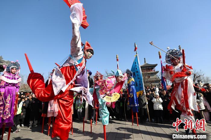 圖為2月9日,霸州市勝芳古鎮(zhèn)花會(huì)活動(dòng)現(xiàn)場(chǎng),同義高蹺老會(huì)帶來精彩表演。賈珺 攝