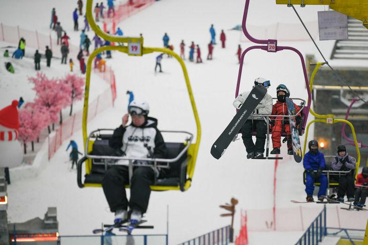 2025年1月12日,在成都熱雪奇跡室內(nèi)滑雪場(chǎng),滑雪愛好者搭乘索道前往高級(jí)道。新華社記者 胥冰潔 攝