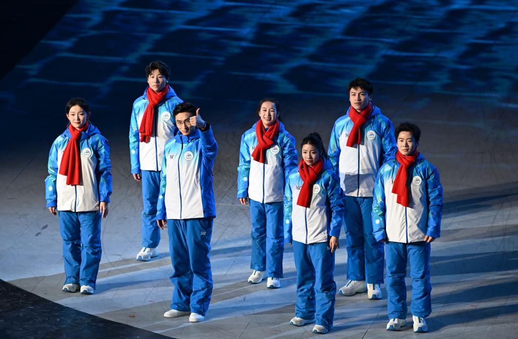 2月14日,志愿者代表們在閉幕式上。新華社記者 黃博涵 攝