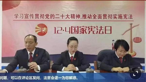 直播互動,深入服務(wù)群眾。為充分發(fā)揮新媒體傳播快、關(guān)注度高、互動性好的特點,黔南中院在新媒體平臺進行庭審直播,讓群眾在觀看直播中學習法律知識,截至目前,通過直播庭審方式普法已達4億人次;連續(xù)兩年,在國家憲法日宣傳中,邀請法官走進直播間釋法、解答群眾法律咨詢,近20萬人次在線觀看。