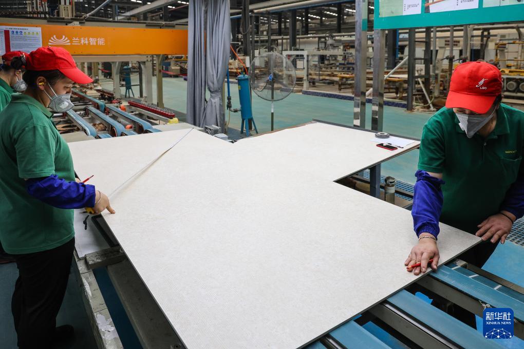 4月22日,工人在佛山蒙娜麗莎大尺寸陶瓷巖板自動(dòng)生產(chǎn)線值守。