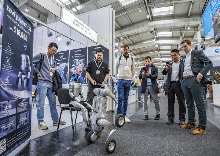 2025年4月1日,在德國漢諾威工業(yè)博覽會上,人們在宇樹科技展區(qū)觀看機器狗演示。新華社記者 張帆 攝