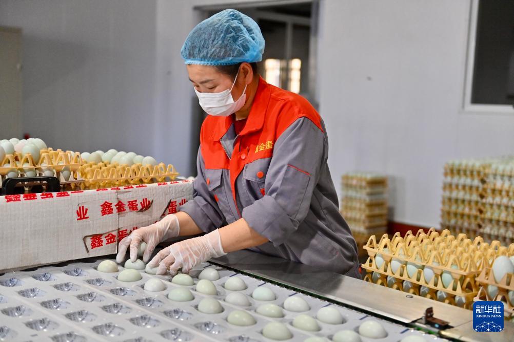 4月24日,在位于遼陽市的遼寧鑫金科技實(shí)業(yè)集團(tuán)有限公司的加工廠內(nèi),工人將鴨蛋碼放到生產(chǎn)線上。