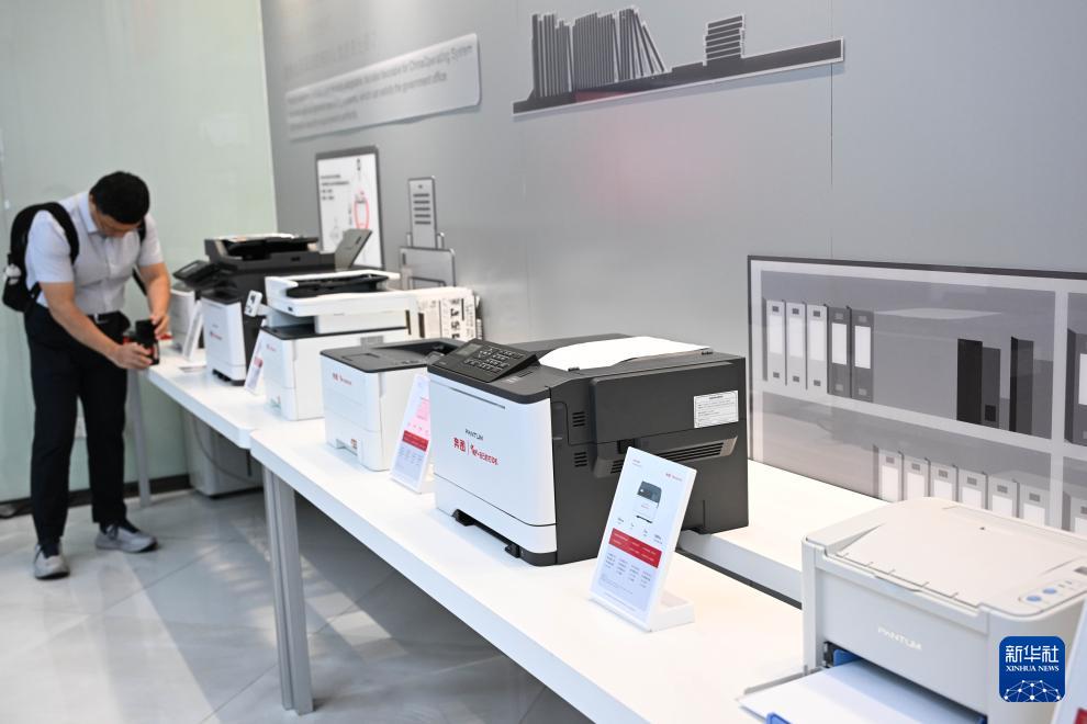 4月29日,參觀者在珠海納思達股份有限公司拍攝奔圖打印機系列產品。