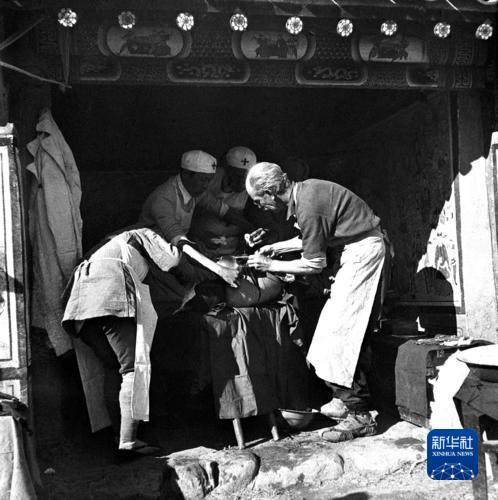 白求恩在晉察冀邊區(qū)淶源縣臨時手術(shù)室里為傷員做手術(shù)。吳印咸 攝