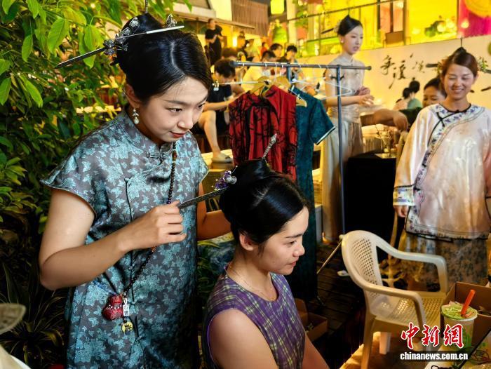 8月23日晚,在福州煙臺山歷史風貌區(qū)的三條簪體驗現場,工作人員正在給一位女孩邊梳妝邊講解頭飾背后的文化寓意。 中新網記者 閆旭 攝