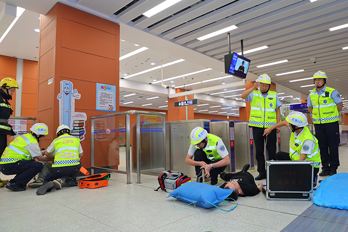 演練現(xiàn)場,模擬末端列車駕駛員室因電氣設(shè)備短路引發(fā)火情,使得列車迫停于區(qū)間,大量乘客受困于車廂內(nèi),同時因無法動車影響其他列車運(yùn)行,導(dǎo)致學(xué)苑北路站客流積壓的事件場景。演練過程組織嚴(yán)密、緊張有序,火災(zāi)警報觸發(fā)后,地鐵運(yùn)營工作人員快速到達(dá)受困車廂安撫“乘客”并就近實(shí)施疏散,在引導(dǎo)“乘客”逃生的同時時刻關(guān)注“乘客”身體狀況,及時開展救助救援和急救措施。車站內(nèi)軌道運(yùn)營企業(yè)先期處置、區(qū)級應(yīng)急力量參與、市指揮部指揮跨區(qū)應(yīng)急聯(lián)動,車站外市消防救援總隊(duì)、市衛(wèi)健委等市指揮部成員單位和區(qū)指揮部成員單位之間協(xié)同配合聯(lián)動處置,各級預(yù)案逐步啟動,各單位、部門及時響應(yīng),對預(yù)設(shè)場景應(yīng)急處置快速得當(dāng)。