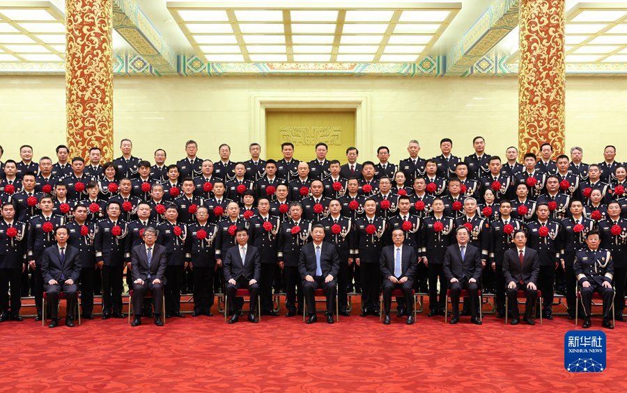 5月25日,黨和國家領(lǐng)導(dǎo)人習(xí)近平、李克強、王滬寧等在北京人民大會堂會見全國公安系統(tǒng)英雄模范立功集體表彰大會代表。新華社記者 姚大偉 攝