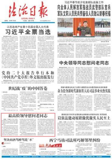 本報(bào)訊 記者張昊 春節(jié)前夕,最高人民檢察院黨組書記、檢察長(zhǎng)張軍慰問韓杼濱、賈春旺,代表最高檢和全體檢察干警衷心祝愿老領(lǐng)導(dǎo)和家人新春愉快、身體健康、闔家幸福。