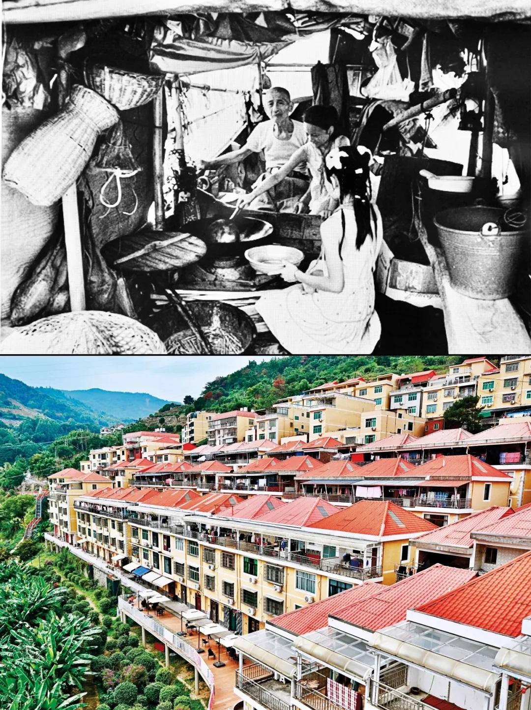 在福建省寧德市福安市下岐村,歷史上,村民祖祖輩輩以在淺海灘涂“討小?!睘樯粭l小木船就是幾代人的家,生活條件異常艱苦,被稱為“連家船民”。20世紀(jì)90年代,福建“造福工程”啟動,下岐村采取“分期分批,全面搬遷”的辦法,將2000多名漁民安置上岸。如今的下岐村,成排的小洋樓矗立,漁民廣場、白馬公園等休閑設(shè)施一應(yīng)俱全,呈現(xiàn)出一幅百姓安居樂業(yè)的現(xiàn)代鄉(xiāng)村圖景。圖為拼版照片:上圖為20世紀(jì)80年代福建寧德地區(qū)的連家船民生活場景(資料照片);下圖為2023年11月15日拍攝的下岐村(新華社記者 姜克紅/攝)。 新華社發(fā)
