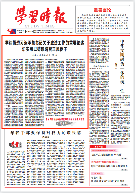 當(dāng)前,全黨上下正在深入開展學(xué)習(xí)貫徹習(xí)近平新時代中國特色社會主義思想主題教育。全國政法機關(guān)和廣大政法干警要認真貫徹落實黨中央決策部署,堅持知行合一、學(xué)以致用,堅持聯(lián)系實際、立足崗位,全面、系統(tǒng)、深入學(xué)習(xí)貫徹習(xí)近平總書記關(guān)于政法工作的重要論述,更加深刻體悟真理的味道、思想的力量,更加深刻領(lǐng)悟“兩個確立”的決定性意義,更加自覺增強“四個意識”、堅定“四個自信”、做到“兩個維護”,進一步提升維護國家政治安全、確保社會大局穩(wěn)定、促進社會公平正義、保障人民安居樂業(yè)的能力水平,推動新時代政法事業(yè)不斷邁上新臺階、開辟新境界。