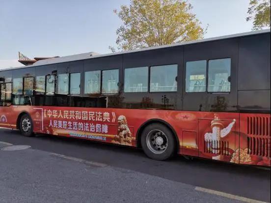在宣傳《民法典》公交車車體內(nèi)外,精心營造學(xué)習(xí)宣傳《民法典》的濃厚氛圍,將《民法典》公交專線主題設(shè)計為“《民法典》與生活同行”,車體以紅色為主基調(diào),圖文并茂,視覺沖擊力強。車內(nèi)兩側(cè)、坐椅靠背、車廂展板等位置進行了全方位包裝,車內(nèi)移動電視持續(xù)播放《民法典》宣傳短視頻,展示《民法典》中見義勇為免責(zé)、小區(qū)共有場地收入歸業(yè)主、夫妻共同債務(wù)如何界定等與百姓生活息息相關(guān)的法條。乘客在乘車的同時,可以感受到學(xué)習(xí)《民法典》的樂趣和必要性。