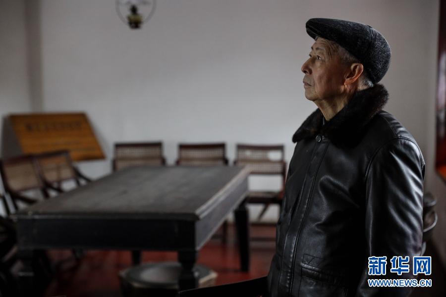 1月27日,83歲的遵義會(huì)議紀(jì)念館原副館長(zhǎng)田興詠在遵義會(huì)議召開的長(zhǎng)方桌前口述歷史。新華社記者 歐東衢 攝