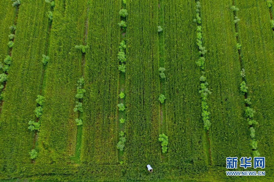 2020年6月23日,在四平市梨樹(shù)縣孤家子鎮(zhèn),忠元種植農(nóng)民專(zhuān)業(yè)合作社理事長(zhǎng)宋忠元查看小冰麥長(zhǎng)勢(shì)(無(wú)人機(jī)照片)。新華社記者 張楠 攝