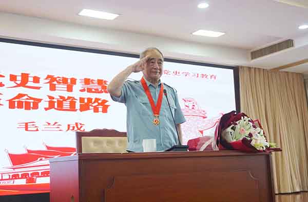 銘記革命歷史,傳承紅色基因?!爸袊萌恕薄⒖哲娎蠎?zhàn)士報(bào)告團(tuán)、洪山區(qū)“五老”報(bào)告團(tuán)團(tuán)長毛蘭成在大會(huì)上以《汲取黨史智慧 走好革命道路》為題為全體黨員作報(bào)告。
