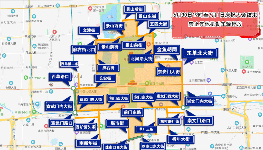 6月30日19時至7月1日慶祝大會結束,由府右街北口經府右街、長安街、西單路口(不含)、宣武門內大街(不含)、宣武門路口(不含)、宣武門東大街、前門西大街、煤市街、珠市口西大街(不含)、珠市口東大街(不含)、前門東路、前門東大街、崇文門西大街、崇文門路口(不含)、崇文門內大街、東單北大街、金魚胡同、東安門大街、北河沿大街、五四大街、景山前街、景山東街、景山后街、景山西街、景山前街、文津街至府右街北口以內區(qū)域、西單橫二條、祈年大街、東打磨廠街、南新華街、香爐營頭條、草廠三條、前門肯德基停車場,除持有慶祝大會專用證件的車輛外,禁止其他機動車輛停放。
